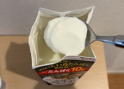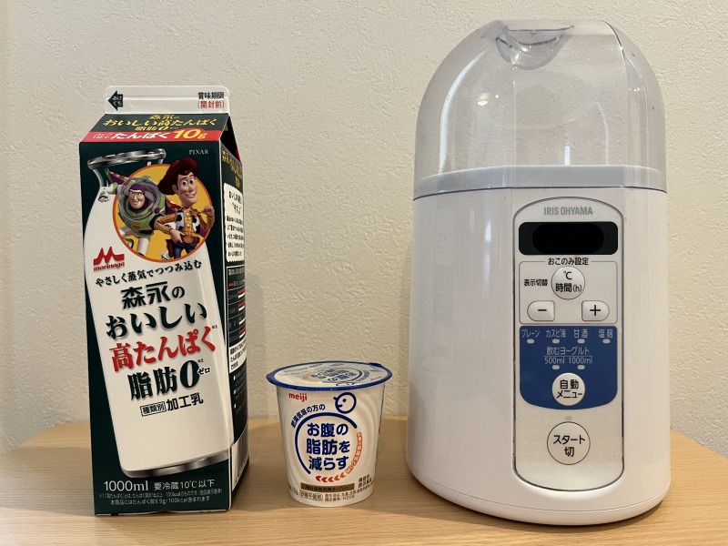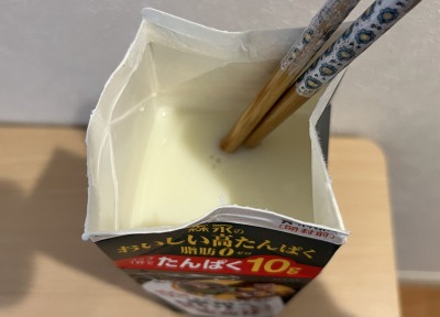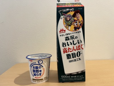 では、「脂肪対策ヨーグルト」を量産してみましょう。ダイエットが目的なので、できるだけ脂肪分の少ない牛乳を使います。今回使用するのは、「森永のおいしい高たんぱく脂肪0 加工乳」です。こちらは200mlあたり10gのたんぱく質が入っていて、さらに脂肪分がゼロという優れものです。