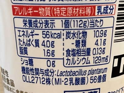 1個当たり112gで56kcal、たんぱく質4.0g、脂質1.6g、炭水化物10.9gです。脂質が入ってますね。これなら「森永のおいしい高たんぱく脂肪0」で量産した方が、脂質も0(ゼロ)ですし、たんぱく質も多くなります。量産した方がダイエットにはよさそうです。