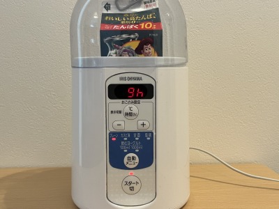 アイリスオーヤマの ヨーグルトメーカー にセットします。温度は42℃、時間は9時間の設定ですが自動メニューがあるのでスタートスイッチを押すだけで製造開始です。