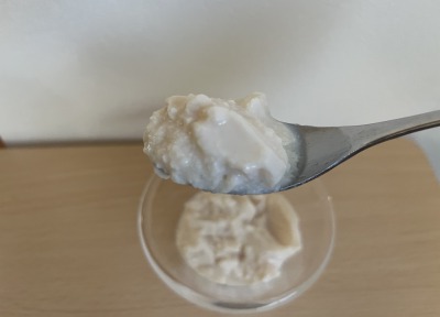 普通のヨーグルトに比べると、ちょっとグレーがかった色味です。滑らかというよりも、寒天が入っているような切り口です。